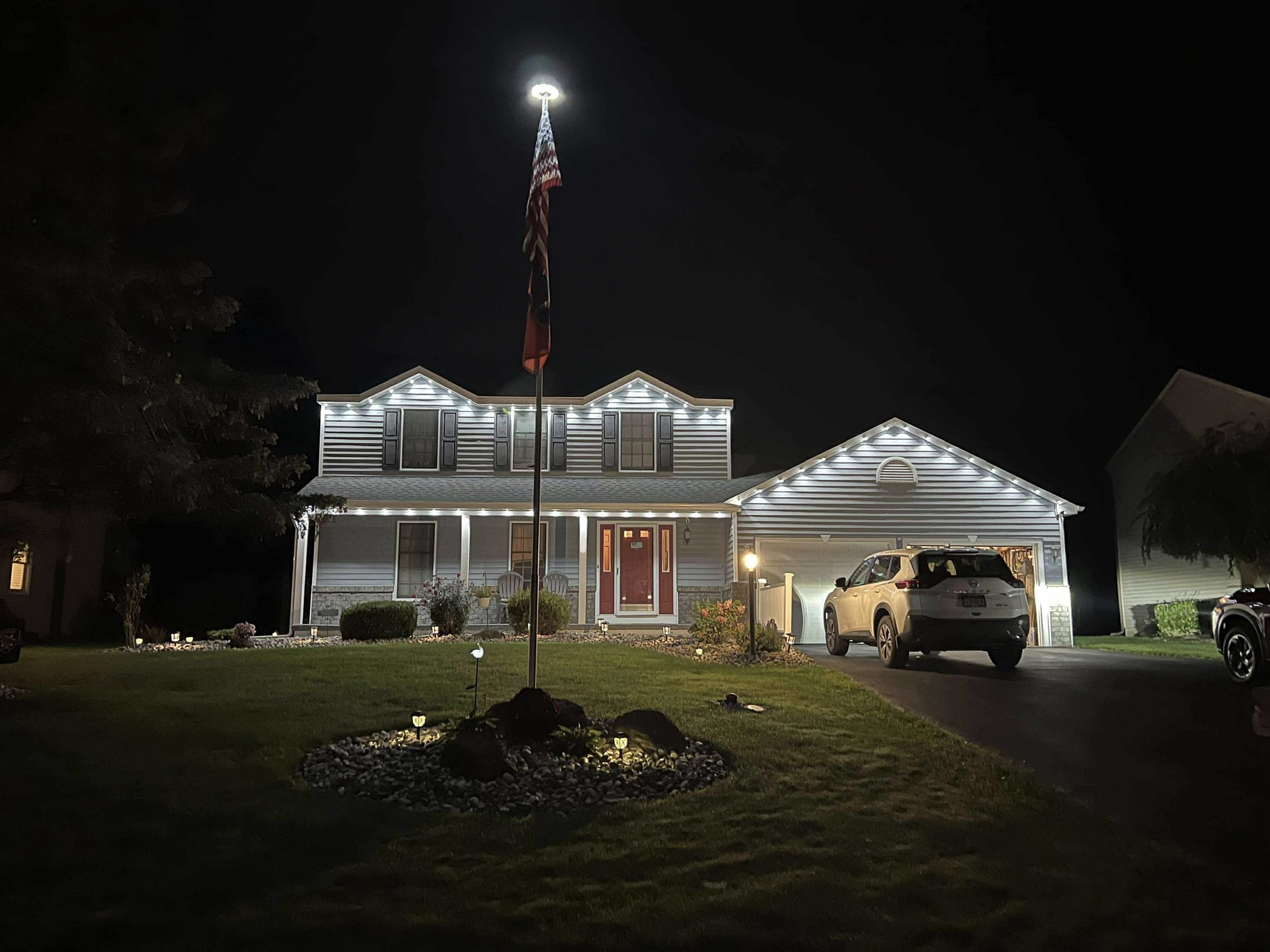 Two-story house with beige siding, black shutters, and a three-car garage. The house is decorated with red and blue lights along the roofline and a lit design on the garage door resembling a sports team's logo. The driveway is paved, leading to the g