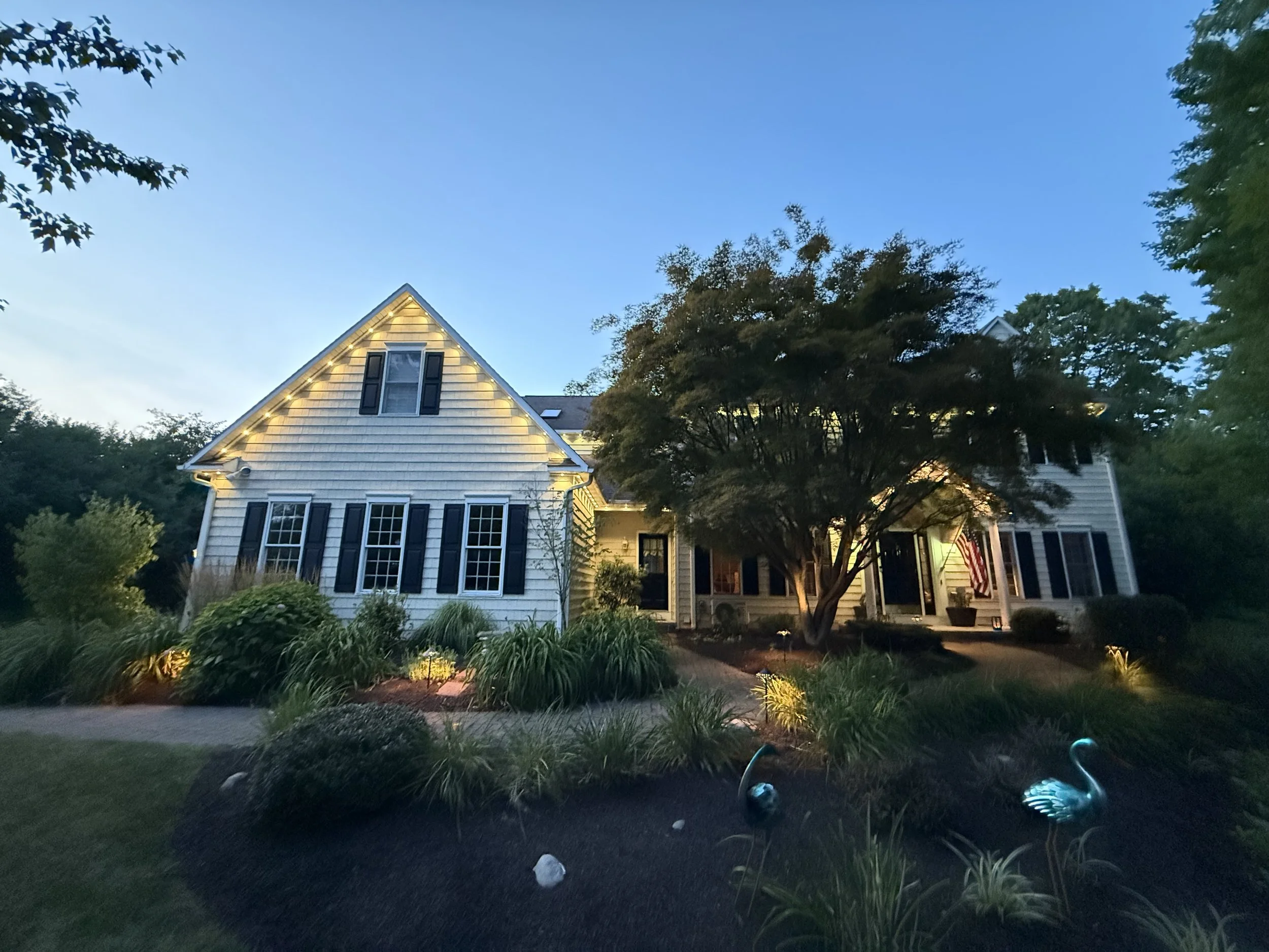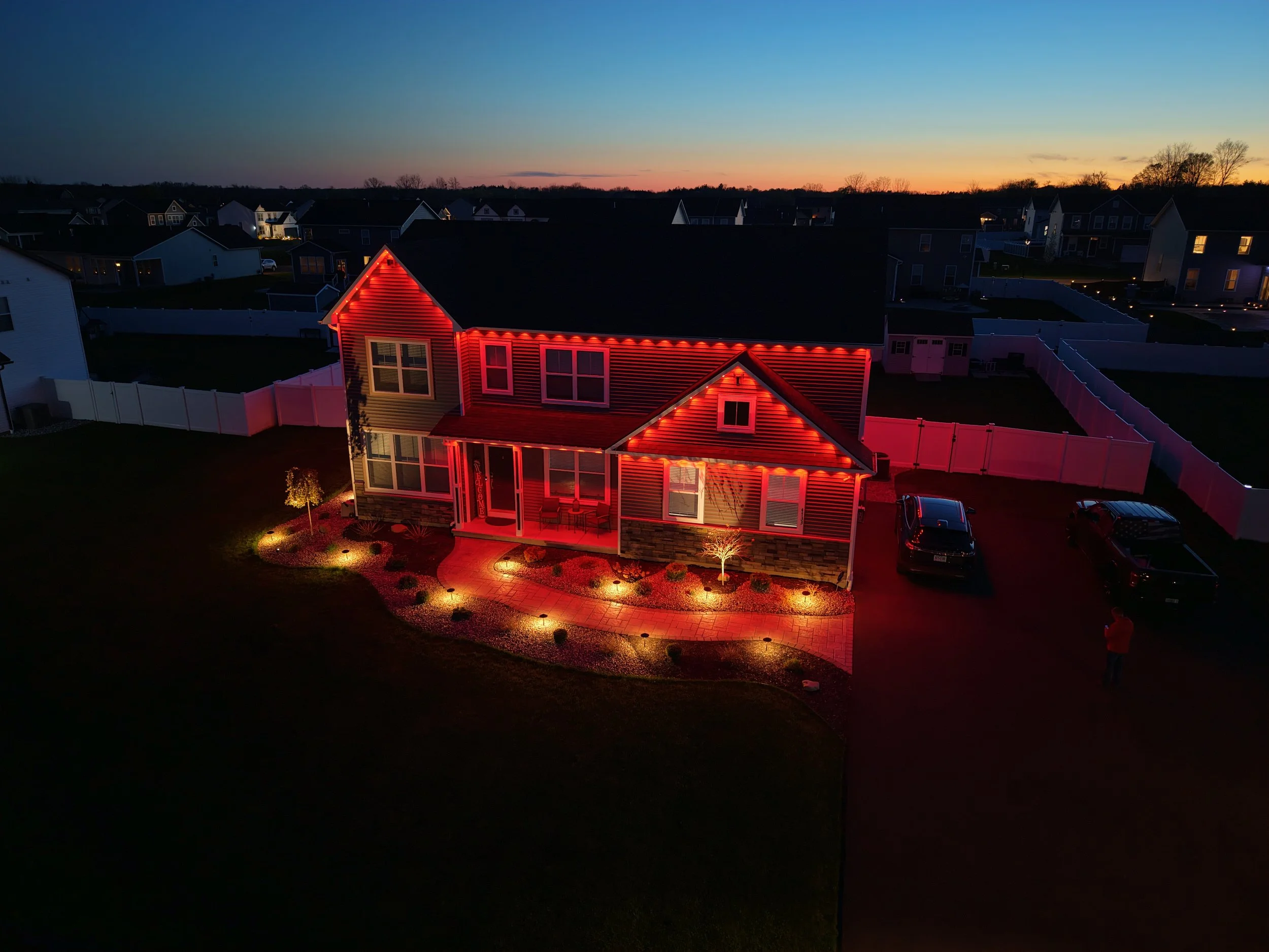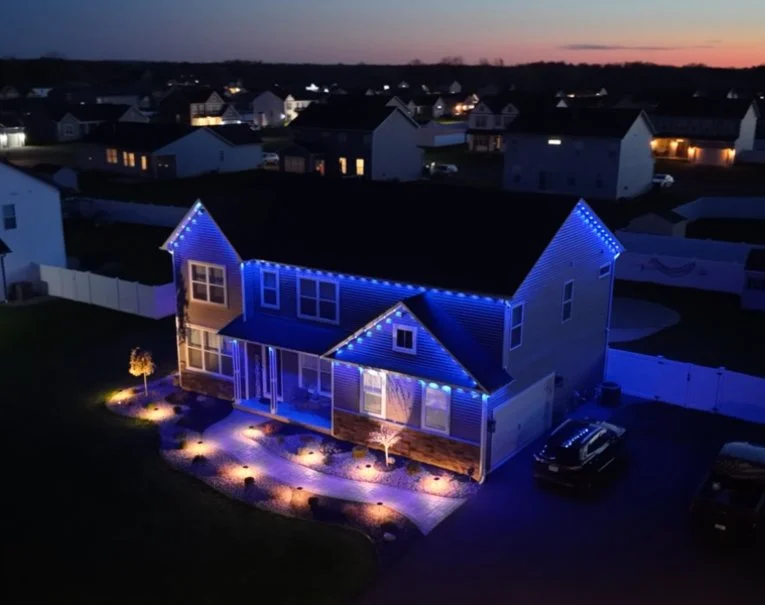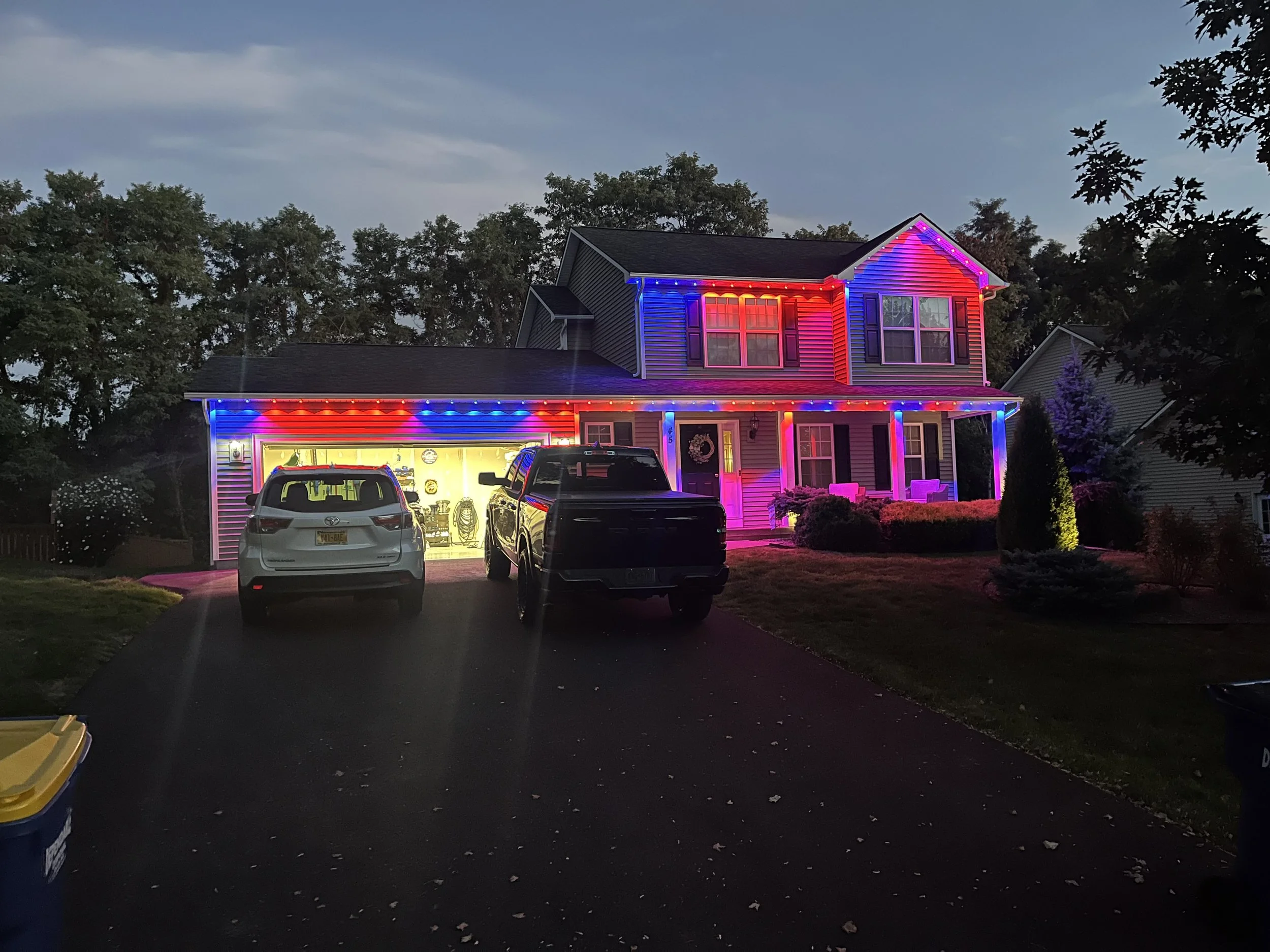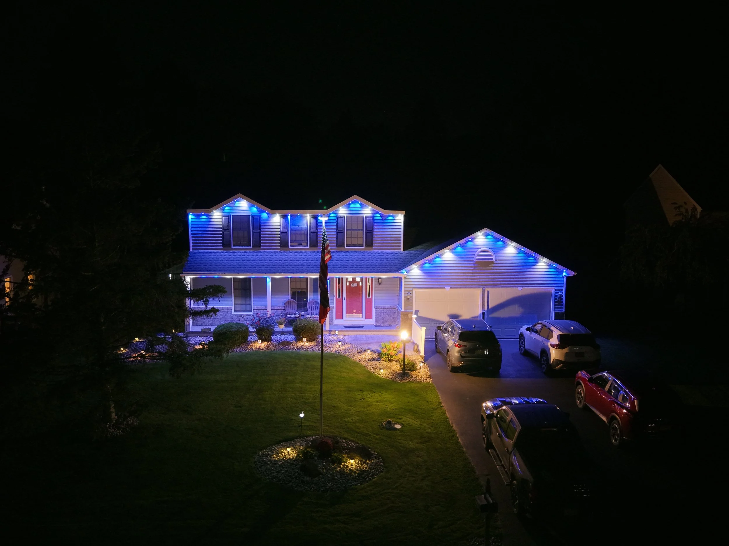 Two-story house with multicolored LED string lights along the roofline, including blue, yellow, green, and red, illuminating the structure at night.