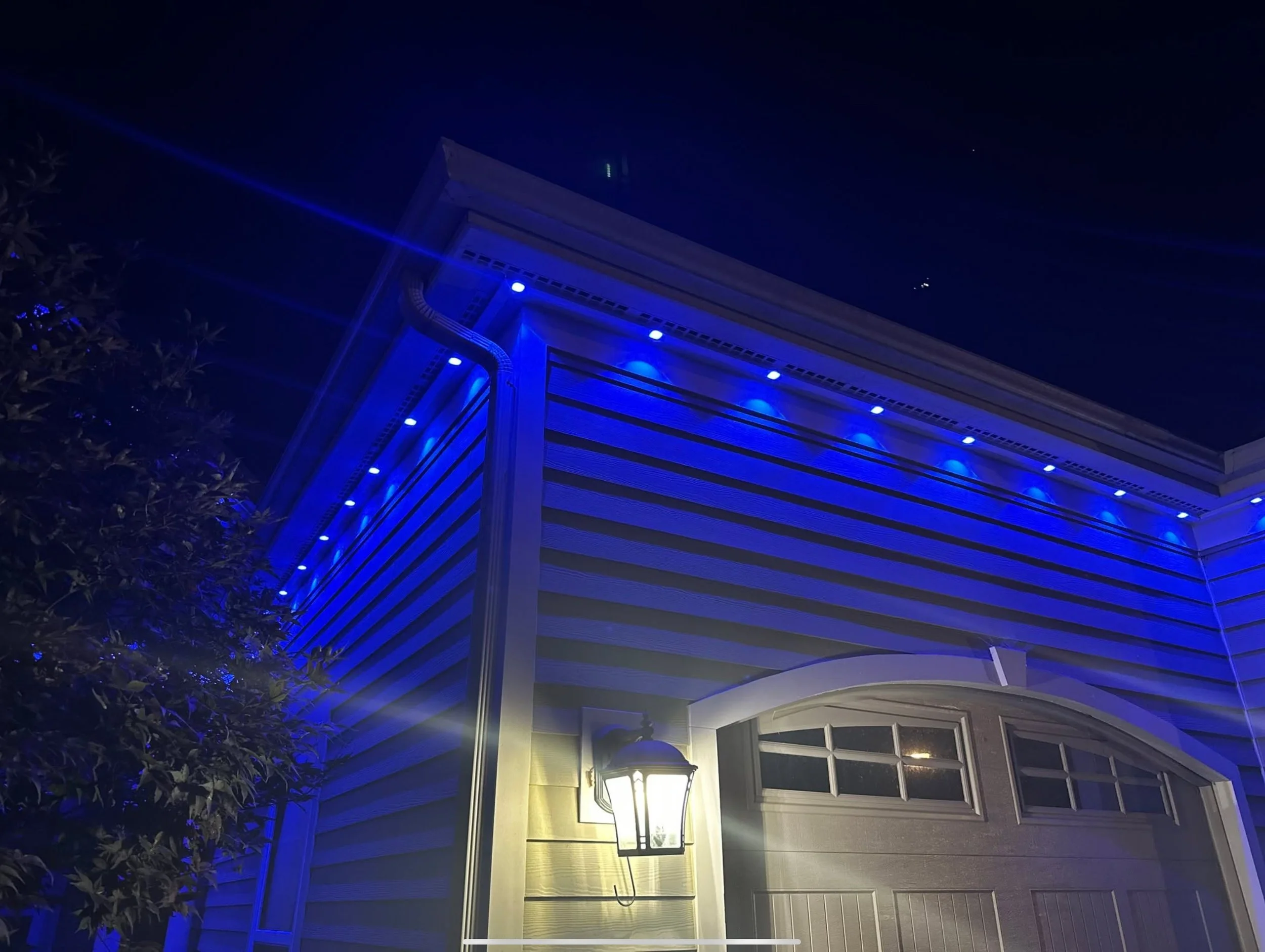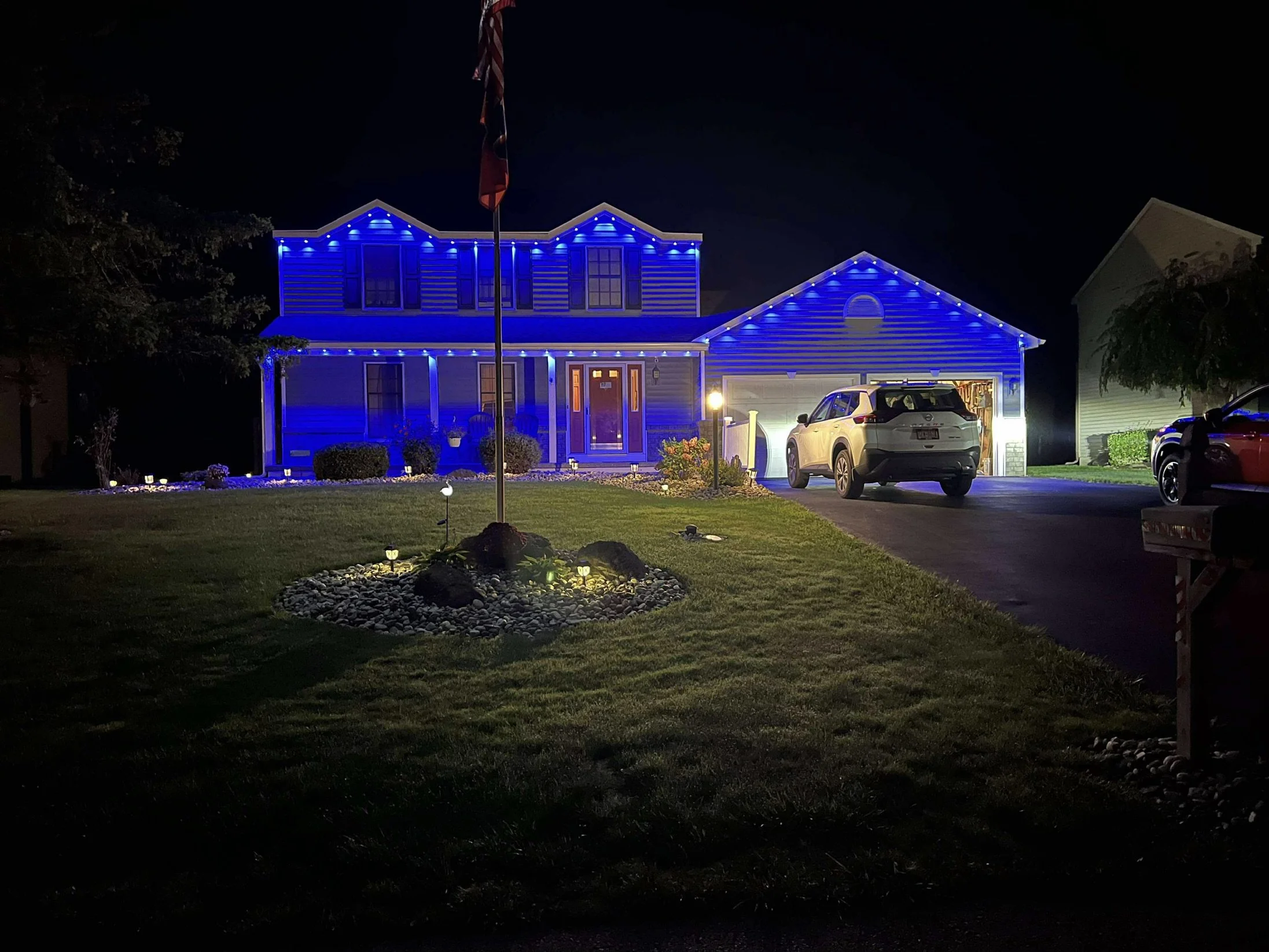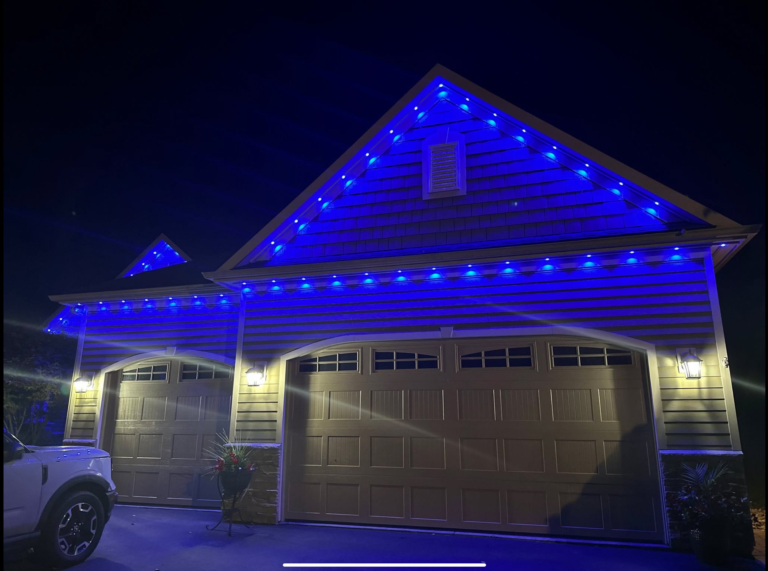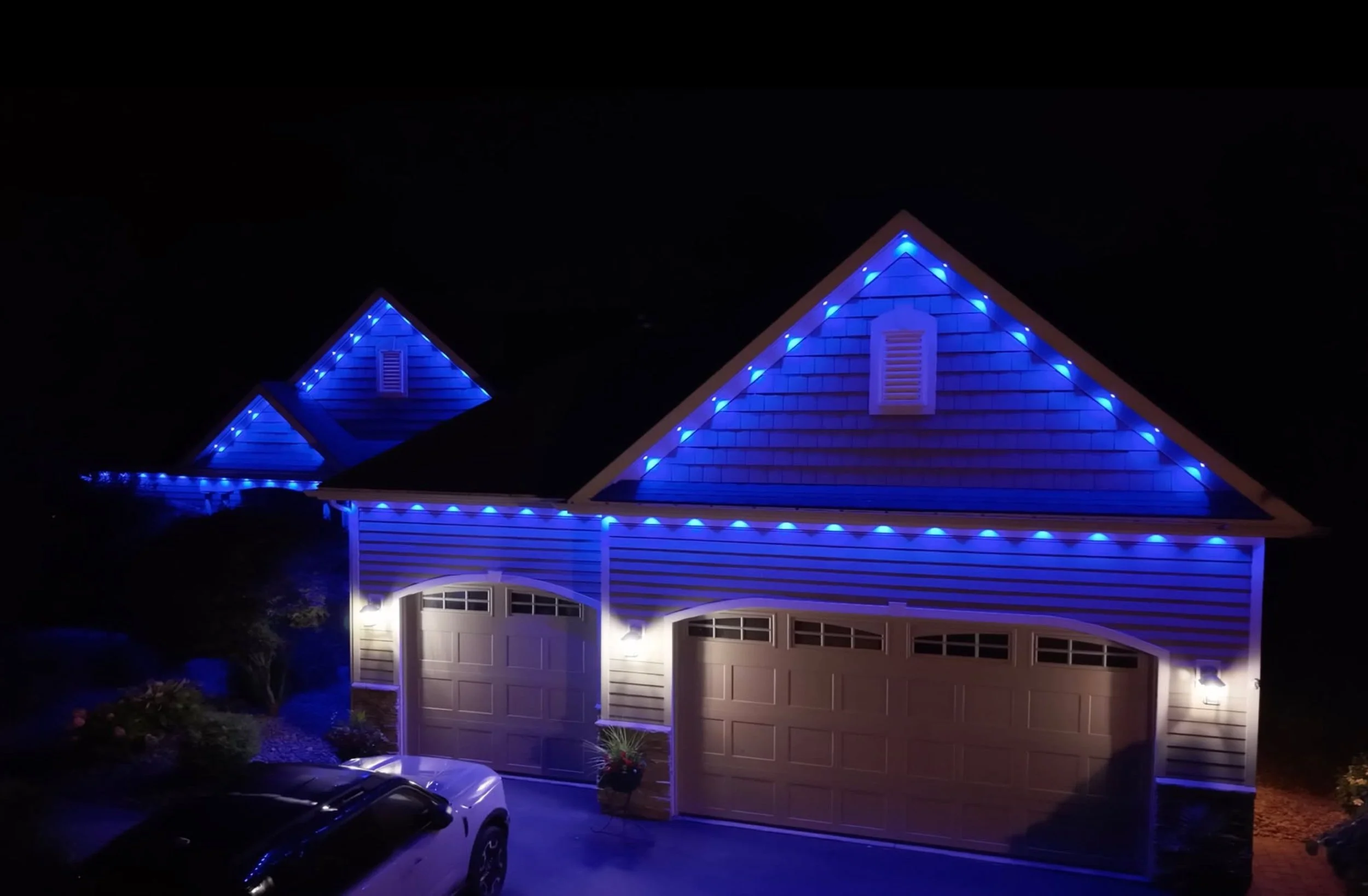 Two-story house decorated with blue and red lights at night, featuring a lit emblem on the garage door.